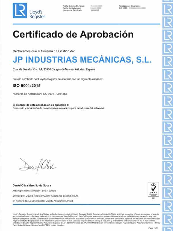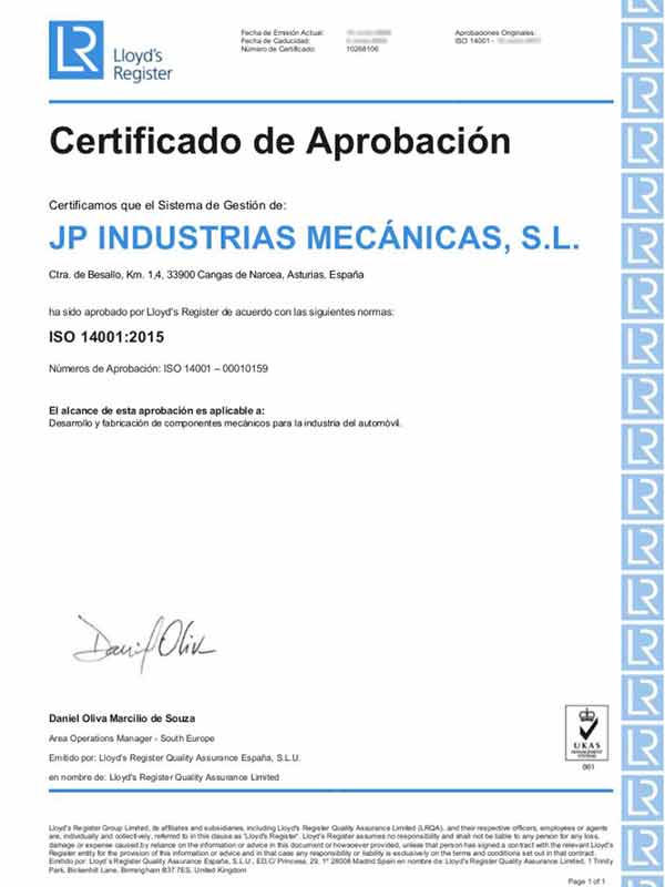 En JP INDUSTRIAS MECÁNICAS, S.L., Todos nuestros equipos están calibrados según ENAC y se utilizan siguiendo los procedimientos ISO 9001, parte de nuestro sistema de gestión de calidad que nos otorga una prestigiosa certificación. Además, nos enorgullece ser conscientes del impacto ambiental de nuestras operaciones. Por ello, nos sometemos a rigurosos controles para mantener el certificado ISO 14001, asegurando que nuestras actividades se desarrollen de manera respetuosa con el entorno y buscando continuamente formas de minimizar nuestro impacto ambiental y contribuir al desarrollo sostenible.